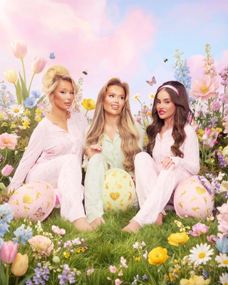 Three women in easter bunny pyjamas sitting among flowers and Easter eggs in a garden setting.